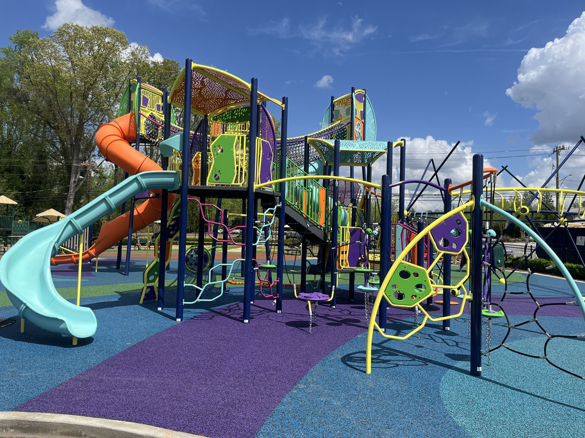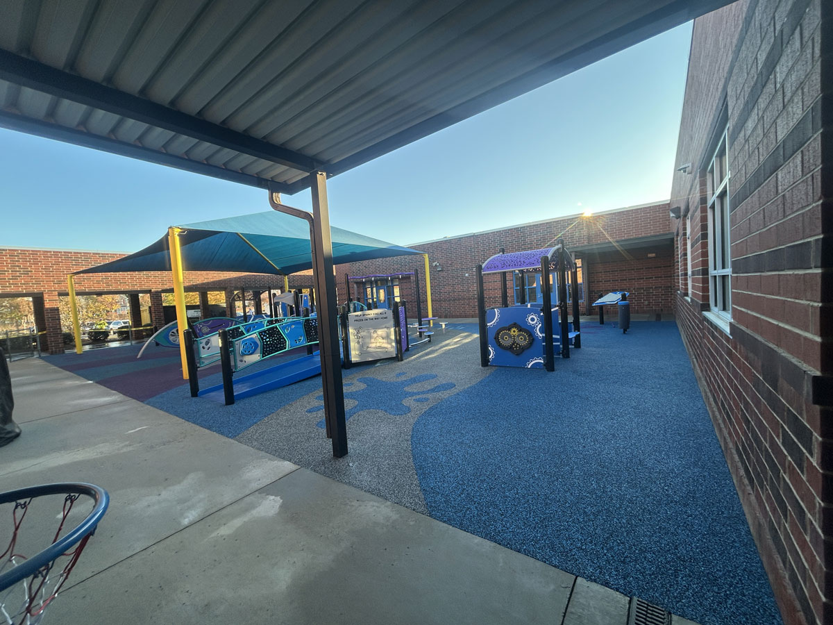 Colorful playground with shaded structures, slides, and textured flooring